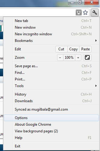 கூகிள் க்ரோம் - பிரவுசரில் "Options" தேர்வு செய்து கொள்ளவும். உதவிக்கு இந்த படத்தைப் பாருங்கள்.