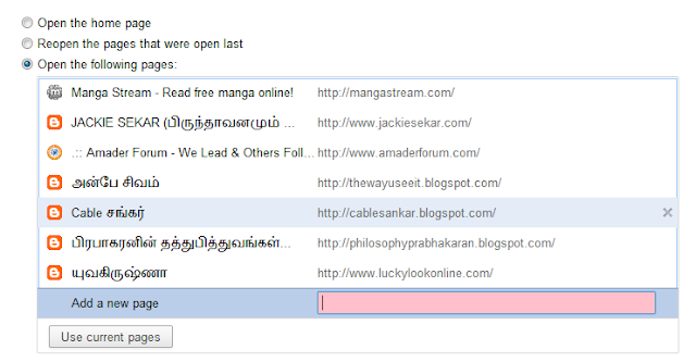 ஒரு புதிய விண்டோ திறக்கும். அதில் "On Startup" என்ற தலைப்பின் கீழ் "Open the following pages:" என்ற வசதியை தேர்வு செய்து கொள்ளுங்கள். பின்னர் உங்களுக்கு பிடித்த வலைத்தள முகவரிகளை ஒன்றன்பின் ஒன்றாக சேர்த்துக் கொள்ளுங்கள். உதவிக்கு இந்த படத்தைப் பாருங்கள்.