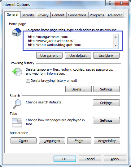 ஒரு புதிய விண்டோ திறக்கும். அதில் "General" என்ற பிரிவின் கீழ் "Home Page" என்ற தலைப்பை பாருங்கள். அதற்கு கீழே உள்ள ஒரு "text box" ல் நீங்கள் விரும்பும் வலைத்தளங்களின் முகவரிகளை சேர்த்துக் கொள்ளவும். உதவிக்கு இந்த படத்தைப் பாருங்கள்.
